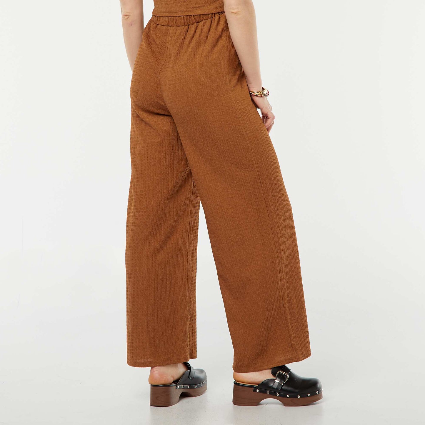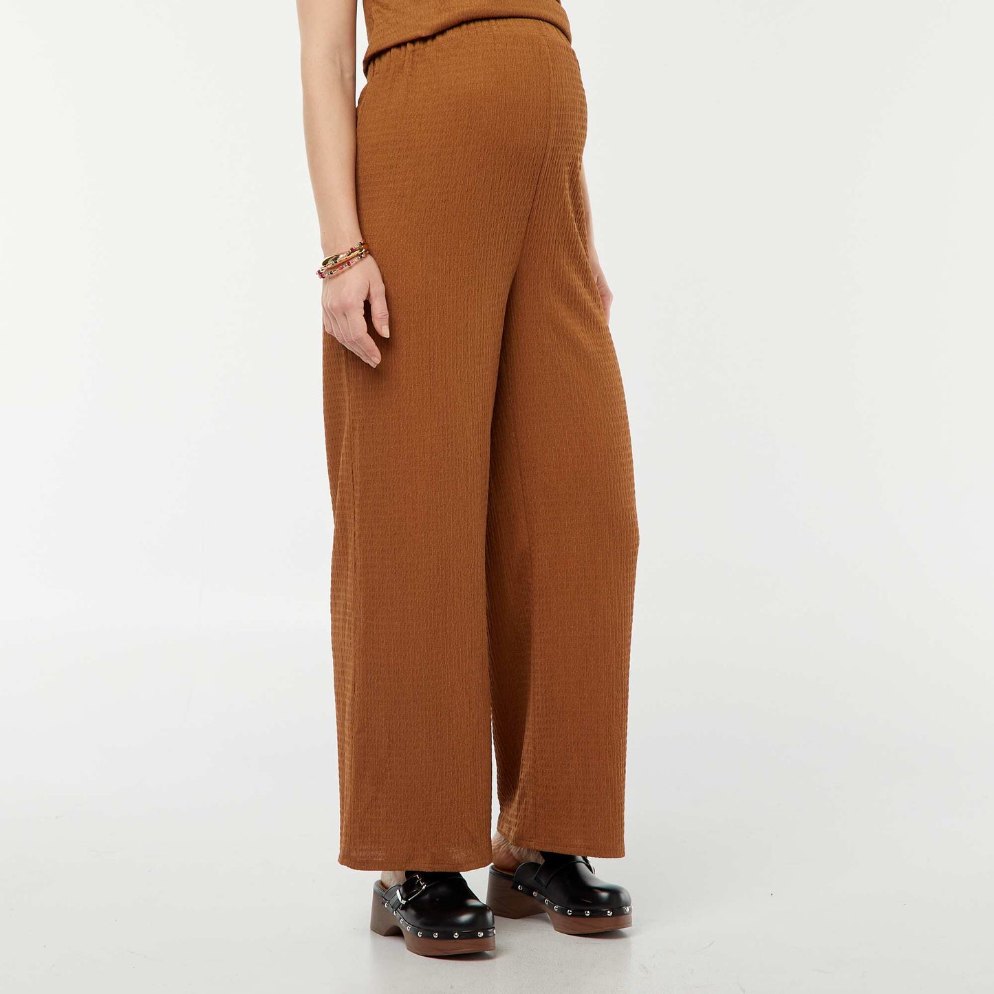 Very classy flowing trousers to keep you comfortable throughout your pregnancy. \n- Maternity trousers \n- Straight cut \n- Crepe fabric \n- Elasticated waist \n- Block colour \n- Inside leg length: approx. 76 cm \n- Hem width: approx. 34 cm \n- Model wears size M and measures 1m79